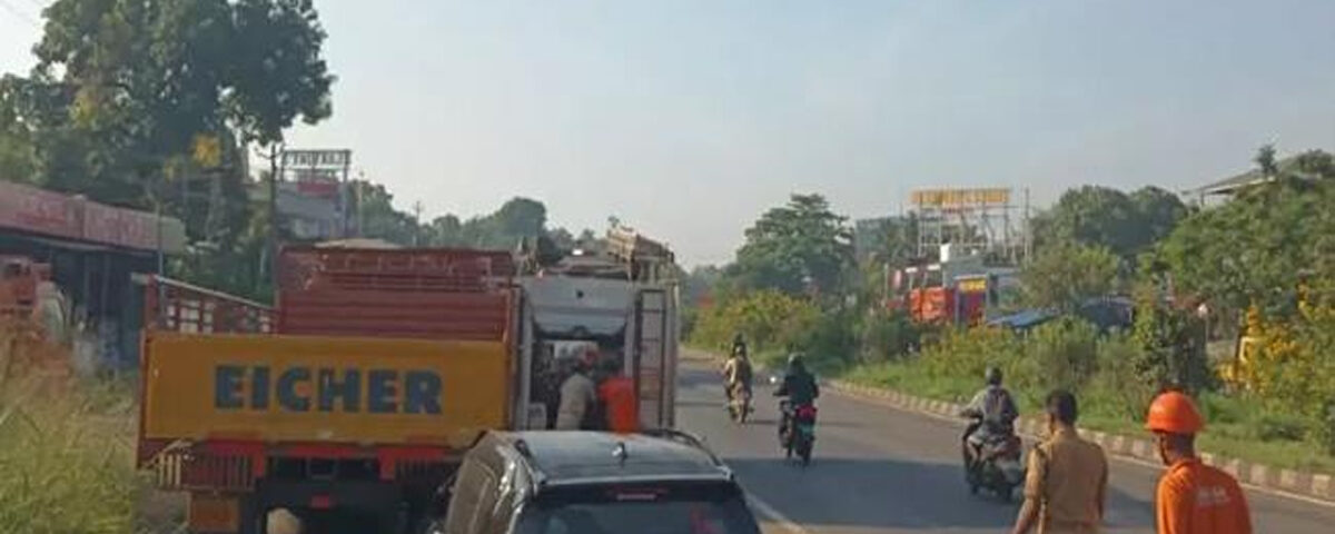 നിയന്ത്രണം വിട്ട കാർ സൈക്കിളിൽ ഇടിക്കുകയും തുടർന്ന് നിർത്തിയിട്ട ചരക്ക് ലോറിയുടെ പിന്നിൽ ഇടിക്കുകയുമായിരുന്നു. അപകടത്തിൽ കാർ യാത്രികർക്കും പരിക്കുണ്ട്.