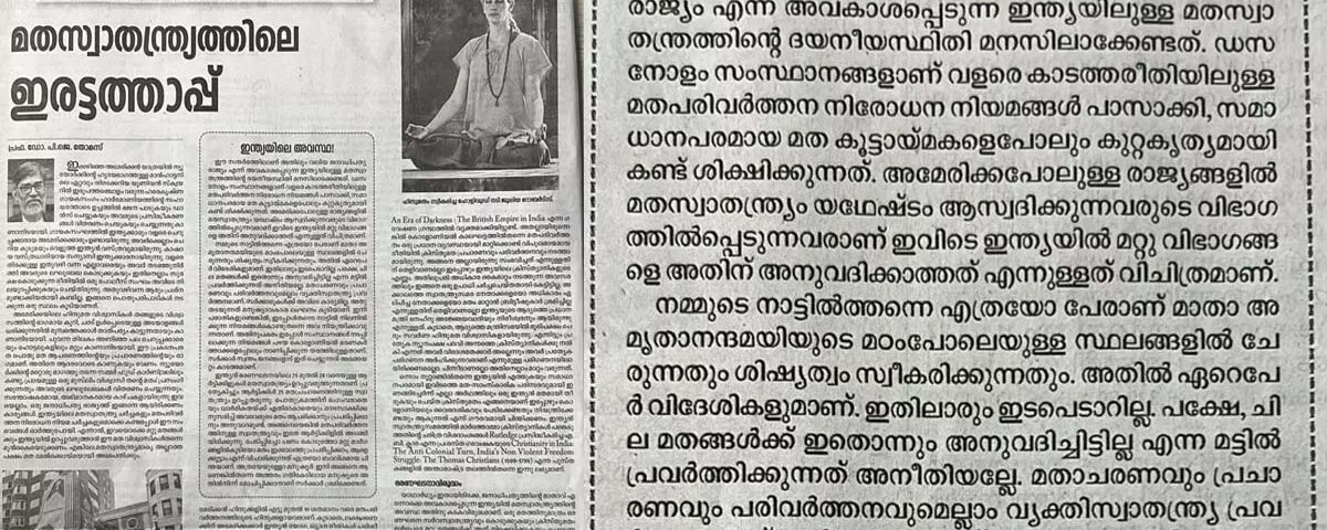 2050 ആകുമ്പോഴേക്കും അമേരിക്കയിലെ ഹിന്ദു ജനസംഖ്യ 30 ലക്ഷത്തില് നിന്നും അരക്കോടിയായി ഉയരും. ജൂലിയ റോബർട്സ് എന്ന ഹോളിവുഡ് നടി ഹിന്ദുമത സ്വീകരിച്ച് അത് പരസ്യപ്പെടുത്തി. ഇന്ത്യയില് മതപ്രചാരണം കുറ്റകൃത്യമാക്കി മറ്റു രാജ്യങ്ങളില് ഹിന്ദുമതപ്രചാരണം ആവേശത്തോടെ നടത്തുന്നു. ഇതര മതങ്ങളുടെ ചെറിയ കൂട്ടായ്മകളെ പോലും ഇന്ത്യയില് ശിക്ഷിക്കുന്നു. അമൃതാനന്ദമയി മഠത്തില് നിരവധി വിദേശികള് ശിഷ്യരായി ചേരുമ്പോഴും ആരും ഇടപെടുന്നില്ല. 12 സംസ്ഥാനങ്ങള് കടുത്ത സ്വഭാവമുള്ള മതപരിവർത്തന നിരോധന നിയമങ്ങള് പാസാക്കി. അമേരിക്കയില് മതസ്വാതന്ത്ര്യം ആസ്വദിച്ച ശേഷം അവർ തന്നെ ഇന്ത്യയില് മറ്റു മതങ്ങളെ ശിക്ഷിക്കുന്നു. മതപരിവർത്തന നിരോധന നിയമം റദ്ദാക്കാന് ഇന്ത്യയിലെ ഹിന്ദുനേതാക്കള് തന്നെ ഇടപെടണമെന്നും ലേഖനത്തിൽ പറയുന്നു.