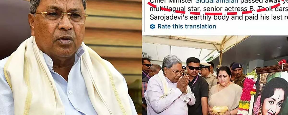 പ്രമുഖ കന്നഡ നടി ബി. സരോജ ദേവിയുടെ മരണത്തിൽ അനുശോചനം രേഖപ്പെടുത്തി മുഖ്യമന്ത്രി സിദ്ധരാമയ്യ ഫെയ്സ് ബുക്കിലും ഇൻസ്റ്റഗ്രാമിലും സന്ദേശം പങ്കുവയ്ക്കുകയായിരുന്നു. കന്നഡയിൽ പങ്കുവച്ച കുറിപ്പ് ഇംഗ്ലീഷിലേക്ക് മാറിയതോടെയാണ് പ്രശ്നമായത്. സംഭവം ഇംഗ്ലീഷിലേക്ക് എത്തിയതോടെ മരിച്ചത് സിദ്ധരാമയ്യയായി. അനുശോചനം അറിയിക്കുന്നത് സരോജ ദേവിയും. ഈ ഗുരുതരമായ പിഴവ് ശ്രദ്ധയിൽ പെട്ടതോടെയാണ് സിദ്ധരാമയ്യ ഗുരുതര വിമർനവുമായി രംഗത്തെത്തിയത്.