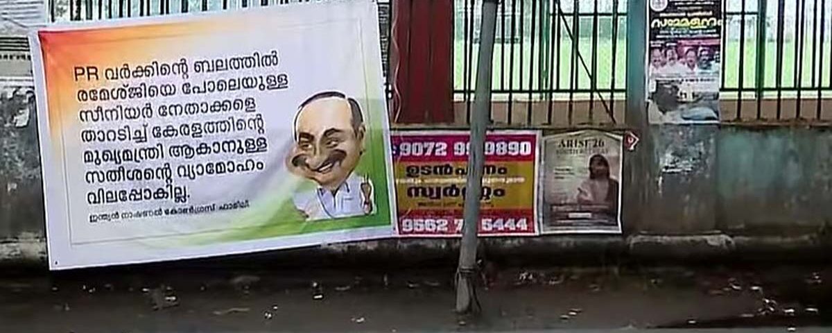 പി ആര് വര്ക്കിന്റെ ബലത്തില് രമേശ് ചെന്നിത്തലയെ പോലെയുള്ള സീനിയര് നേതാക്കളെ താറടിച്ച് കേരളത്തിന്റെ മുഖ്യമന്ത്രി ആകാനുള്ള സതീശന്റെ വ്യാമോഹം വിലപ്പോകില്ലെന്നാണ് ഫ്ലക്സ് ബോര്ഡിലുള്ളത്. വി ഡി സതീശന്റെ പിആര് പണി അവസാനിപ്പിക്കണമെന്നും കോണ്ഗ്രസ് മുഖ്യമന്ത്രിയെ ഹൈക്കമാന്ഡ് തീരുമാനിക്കുമെന്നും പോസ്റ്ററില് കുറിച്ചിട്ടുണ്ട്.