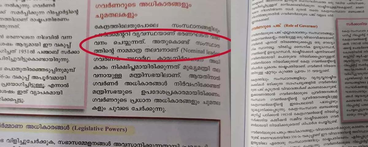 യഥാർത്ഥ കാര്യനിർവഹണ അധികാരം നിക്ഷിപ്തമായിരിക്കുന്നത് മുഖ്യമന്ത്രി തലവനായ മന്ത്രിസഭയിലെന്നും പാഠഭാഗം വിശദീകരിക്കുന്നു. ഗവർണർ അധികാരങ്ങൾ നിർവഹിക്കേണ്ടത് മന്ത്രിസഭയുടെ ഉപദേശപ്രകാരം തുടങ്ങിയ വിവരങ്ങളാണ് പാഠഭാഗത്തിലുള്ളത്. ഗവർണർമാർ മുഖ്യമന്ത്രിയുടെ നേതൃത്വത്തിലുള്ള മന്ത്രിസഭയെ നിയന്ത്രിക്കുന്ന അധികാരികളല്ല, ഗവർണർ എന്നത് തെരഞ്ഞെടുക്കപ്പെട്ട ഒരു ഔദ്യോഗിക സ്ഥാനമല്ലെന്നും പാഠഭാഗത്തിൽ പറയുന്നു.