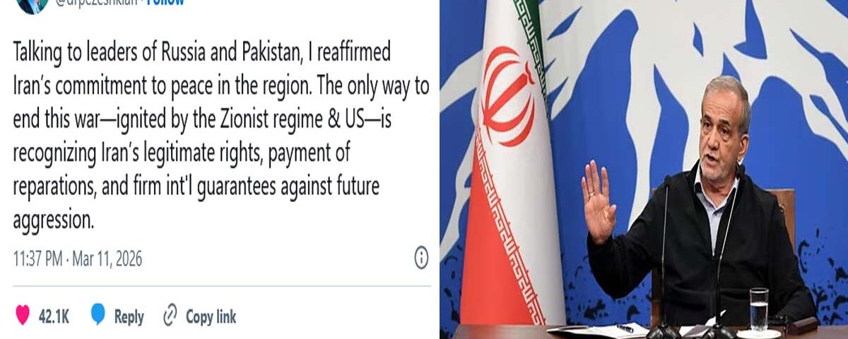യുദ്ധം അവസാനിപ്പിക്കാന് ഇറാന് മുന്നിലുള്ള വിഷയങ്ങള് റഷ്യ, പാകിസ്ഥാന് രാജ്യങ്ങള് എന്നിവിടങ്ങളിലെ നേതാക്കളുമായി സംസാരിച്ചപ്പോള് അറിയിച്ചിരുന്നു. സയണിസ്റ്റ് ഭരണകൂടവും യുഎസും ആരംഭിച്ച ഈ യുദ്ധം അവസാനിപ്പിക്കാനുള്ള ഏക മാര്ഗം ഇറാന്റെ നിയമാനുസൃത അവകാശങ്ങള് അംഗീകരിക്കുക, നഷ്ടപരിഹാരം നല്കുക, ഭാവിയിലെ ആക്രമണങ്ങള്ക്കെതിരെ ഉറച്ച അന്താരാഷ്ട്ര ഗ്യാരണ്ടികള് നല്കുക എന്നിവയാണ്. എന്ന് ഇറാന് പ്രസിഡന്റ് ട്വിറ്ററില് കുറിച്ചു.
