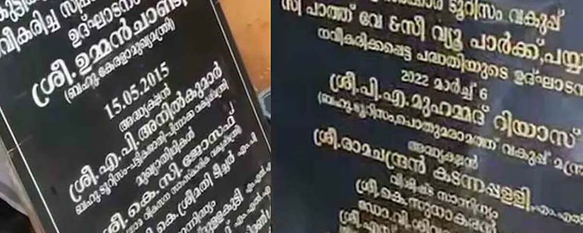 2015 മെയ് 15ന് നടന്ന ഉദ്ഘാടന ചടങ്ങിന്റെ ശിലാഫലകം അടര്ത്തിയെടുത്ത് മാറ്റി അതേ സ്ഥലത്ത് പുതിയ ശിലാഫലകം മുഹമ്മദ് റിയാസ് ഉദ്ഘാടനം ചെയ്തതായി കാണിച്ച് സ്ഥാപിക്കുകയാണ് ചെയ്തത്. ഉമ്മന് ചാണ്ടിയുടെ പേരുള്ള ശിലാഫലകം കുപ്പത്തൊട്ടിയില് തള്ളി അതിന്മേല് ചൂലെടുത്തു വെച്ച നിലയില് കണ്ടെത്തിയെന്നുമായിരുന്നു കോണ്ഗ്രസ് നേതാക്കളുടെ ആരോപണം. ആരുടെ നിര്ദ്ദേശപ്രകാരമാണ് ഇതു ചെയ്തതെന്ന് വ്യക്തമാക്കണം. ഉമ്മന് ചാണ്ടി ഉദ്ഘാടനം ചെയ്തതിന്റെ ശിലാഫലകം കോണ്ഗ്രസ് പ്രവര്ത്തകര് പാര്ക്കിന്റെ കവാടത്തില് വെച്ചിട്ടുണ്ട്. ഇതു തകര്ക്കുകയോ എടുത്തുമാറ്റുകയോ ചെയതാല് ഇവിടെ തന്നെ പുന:സ്ഥാപിക്കുമെന്നും ജില്ലാ കോണ്ഗ്രസ് നേതൃത്വം വ്യക്തമാക്കിയിരുന്നു.