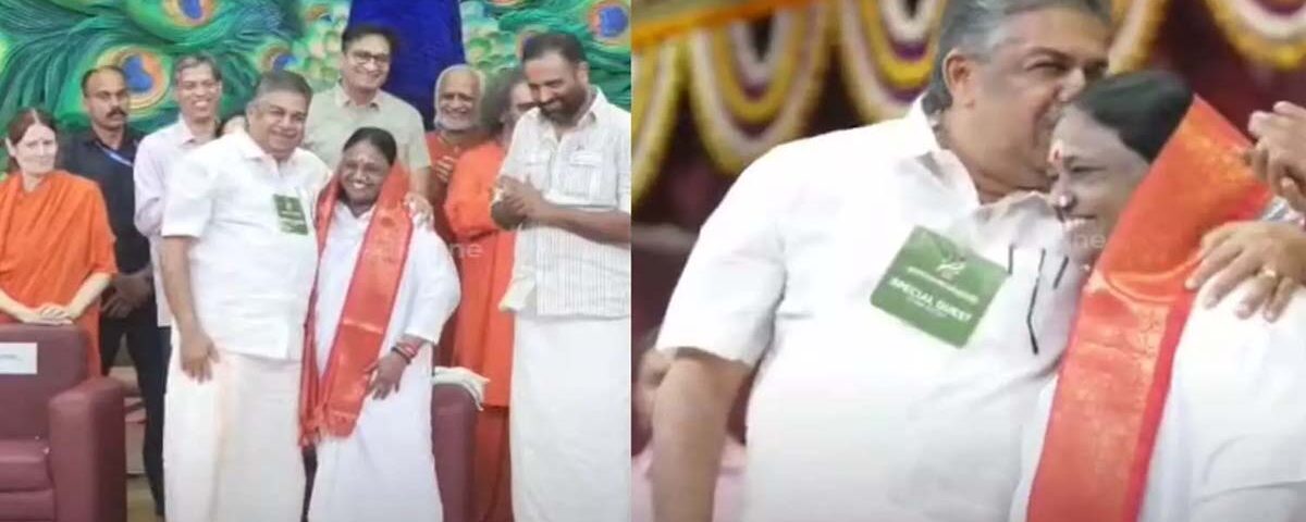 കൊല്ലം : ഐക്യരാഷ്ട്രസഭയിൽ അമൃതാനന്ദമയി സംസാരിച്ചതിന്റെ 25ാം വാർഷികത്തോട് അനുബന്ധിച്ചു സംസ്ഥാന സർക്കാരിന്റെ ആദരം കഴിഞ്ഞ ദിവസം മന്ത്രി സജി ചെറിയാൻ സമർപ്പിച്ചു. വെള്ളിയാഴ്ച അമൃത വിശ്വവിദ്യാപീഠം അമൃതപുരി കാമ്പസിൽ നടന്ന ചടങ്ങിലാണ് സർക്കാരിന്റെ വക ആദരം സജി ചെറിയാൻ സമർപ്പിച്ചത്. അമൃതാന്ദമയിയെ ചേർത്ത് പിടിച്ച് ആശ്ലേഷിച്ച് നെറുകയിൽ ചുംബിച്ച് ചിത്രങ്ങളെടുക്കാനായി മന്ത്രി പോസ് ചെയ്യുകയും ചെയ്തു.