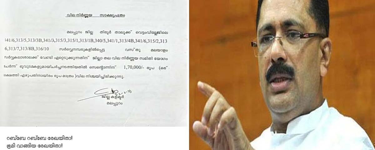 2016 ഫെബ്രുവരി 22-ന് ജില്ലാ കലക്ടര് ഒപ്പിട്ട വിലനിര്ണയ സാക്ഷ്യപത്രമാണ് ജലീല് പുറത്തുവിട്ടത്. ലീഗ് നേതാവ് സി മമ്മൂട്ടി തിരൂര് എംഎല്എ ആയിരുന്ന സമയത്ത് 2016 ഫെബ്രുവരിയില് മലപ്പുറത്ത് കലക്ടറുടെ ചേംബറില് ചേര്ന്ന യോഗത്തിലാണ് 17 ഏക്കര് 21 സെന്റ് സ്ഥലം ഏറ്റെടുക്കാന് തീരുമാനിച്ചതെന്നും ഒരു സെന്റിന് 1,70,000 രൂപയായിരുന്നു നിശ്ചയിച്ചതെന്നും ജലീല് കഴിഞ്ഞ ദിവസം മാധ്യമങ്ങളോട് പറഞ്ഞിരുന്നു. ഇതിന് പിന്നാലെ ഭൂമിയേറ്റെടുപ്പ് വിഷയത്തില് വിജിലന്സ് അന്വേഷണത്തിന് തയ്യാറാണോയെന്ന് പി കെ ഫിറോസ് ജലീലിനെ വെല്ലുവിളിച്ചു.