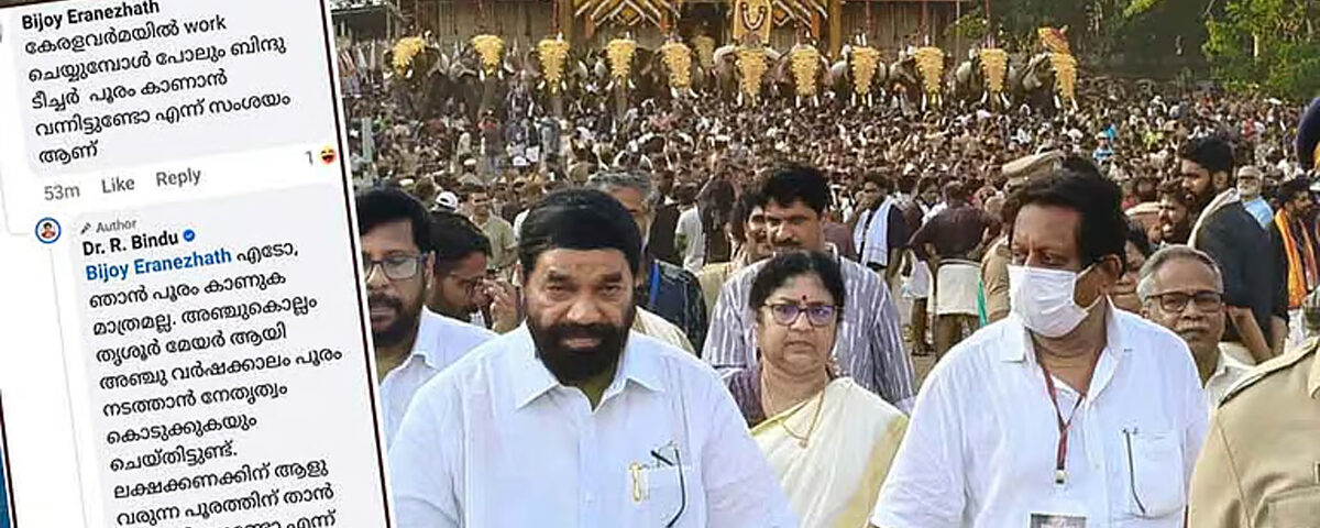 കേരള വര്മയില് അധ്യാപിക ആയിരുന്ന കാലത്ത് പോലും ആര് ബിന്ദു പൂരം കാണാന് വന്നിട്ടുണ്ടോ എന്നാണ് മന്ത്രിയുടെ പോസ്റ്റില് പ്രത്യക്ഷപ്പെട്ട കമന്റുകളില് ഒന്ന്. ഇതിന് രൂക്ഷമായ ഭാഷയിലാണ് മന്ത്രി മറുപടി നല്കിയിരിക്കുന്നത്.