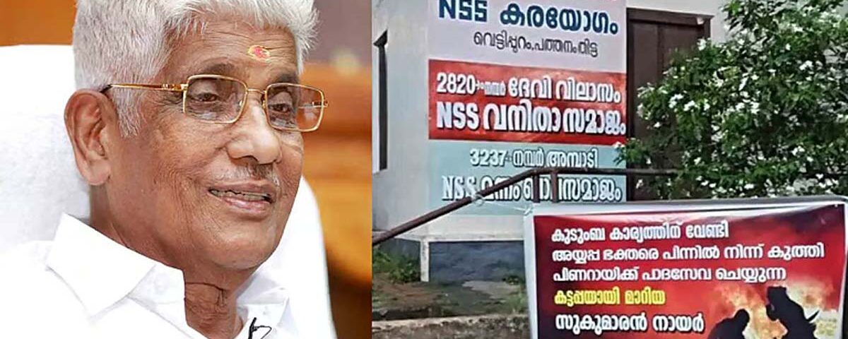 സുകുമാരന് നായര് സമുദായത്തിന് നാണക്കേടാണെന്നും ബാനറില് എഴുതിയിട്ടുണ്ട്. പത്തനംതിട്ട വെട്ടിപ്പുറം ശ്രീകൃഷ്ണവിലാസം 115 നമ്പര് എന്എസ്എസ് കരയോഗം ഓഫീസിന് മുന്നിലാണ് ബാനര് പ്രത്യക്ഷപ്പെട്ടത്. പിന്നില് നിന്നും കുത്തുന്ന കട്ടപ്പയുടെ ബാഹുബലി ചിത്രവും പോസ്റ്ററിലുണ്ട്.