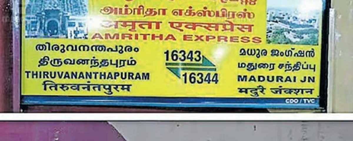 2025 ഒക്ടോബറിലാണു തിരുവനന്തപുരംമധുര അമൃത എക്സ്പ്രസ് രാമേശ്വരത്തേക്കു നീട്ടിയത്. അതുവരെ ട്രെയിനില് ശ്രീപത്മനാഭ സ്വാമി ക്ഷേത്രത്തിന്റെയും മധുര മീനാക്ഷി ക്ഷേത്രത്തിന്റെയും ചിത്രങ്ങളുള്ള ബോര്ഡ് ഉണ്ടായിരുന്നു. താഴെ ആദ്യ വരിയില് മലയാളത്തില് ട്രെയിനിന്റെ പേരുമുണ്ടായിരുന്നു.