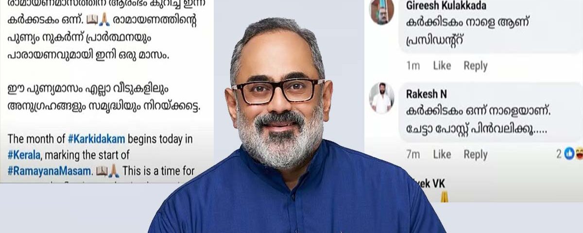 തിരുവനന്തപുരം : രാമായണ മാസം തുടങ്ങിയതായി തെറ്റായി ഫെയ്സ്ബുക്ക് പോസ്റ്റിട്ട ബിജെപി സംസ്ഥാന അധ്യക്ഷന് രാജീവ് ചന്ദ്രശേഖറിന് ട്രോള് പൂരം. രാമായണ മാസ ആശംസയും, ഈ പുണ്യമാസം എല്ലാ വീടുകളിലും അനുഗ്രഹങ്ങളും സമൃദ്ധിയും നിറയ്ക്കട്ടെ എന്ന് ആശംസിച്ചുകൊണ്ടുമുള്ളതായിരുന്നു പോസ്റ്റ്. അബദ്ധം മനസ്സിലായതോടെ പോസ്റ്റ് പിന്വലിച്ചു.