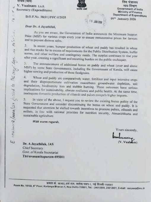 നെല്ലും ഗോതമ്പും ഉൾപ്പെടെയുള്ള വിളകൾ കർഷകരിൽ നിന്നും യൂണിയൻ സർക്കാർ വഴി താങ്ങുവില നൽകി ശേഖരിക്കുന്നത് കർഷകരെ സഹായിക്കുന്നതിനായാണ്. എന്നാൽ കേരളമുൾപ്പെടെയുള്ള ചില സംസ്ഥാനങ്ങൾ ഒരു വിഹിതം കൂടി കർഷകർക്ക് നൽകുന്നത് വഴി നെല്ലിന്റെയും ഗോതമ്പിന്റേയും ഉത്പാദനം രാജ്യത്ത് വർധിക്കുന്നതിന് കാരണമാകുന്നുവെന്നാണ് കേന്ദ്രത്തിന്റെ വിശദീകരണം. ഇത്രയും നെല്ല് സംഭരിക്കാനുള്ള സൗകര്യം രാജ്യത്തില്ലെന്നും ചീഫ് സെക്രട്ടറിക്ക് അയച്ച കത്തിൽ പറയുന്നു. ധാരാളമായി വെള്ളം വേണ്ട കൃഷിയായതിനാൽ ഭൂഗർഭ ജലലഭ്യതയേയും പ്രതികൂലമായി ബാധിക്കുമെന്നും കത്തിൽ പറയുന്നു.
