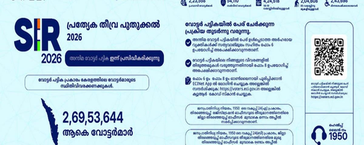 തിരുവനന്തപുരം : സംസ്ഥാനത്തെ വോട്ടര് പട്ടിക തീവ്ര പരിഷ്കരണത്തിന് ശേഷമുള്ള അന്തിമ വോട്ടര്പട്ടിക ഇന്ന് പ്രസിദ്ധീകരിക്കും. തെരഞ്ഞെടുപ്പ് കമ്മീഷന് പുറത്തുവിട്ട കണക്ക് പ്രകാരം അന്തിമ വോട്ടര്പട്ടികയില് 2.69 കോടി വോട്ടര്മാരാണുള്ളത്. കരട് പട്ടികയില് നിന്ന് 53,229 പേരെ ഒഴിവാക്കിയെങ്കിലും പുതിയ അപേക്ഷകള് പരിഗണിച്ചത് കൂടി കണക്കാക്കുമ്പോള് അന്തിമ പട്ടികയില് 15,11,292 വോട്ടര്മാരുടെ വര്ധനയുണ്ട്.