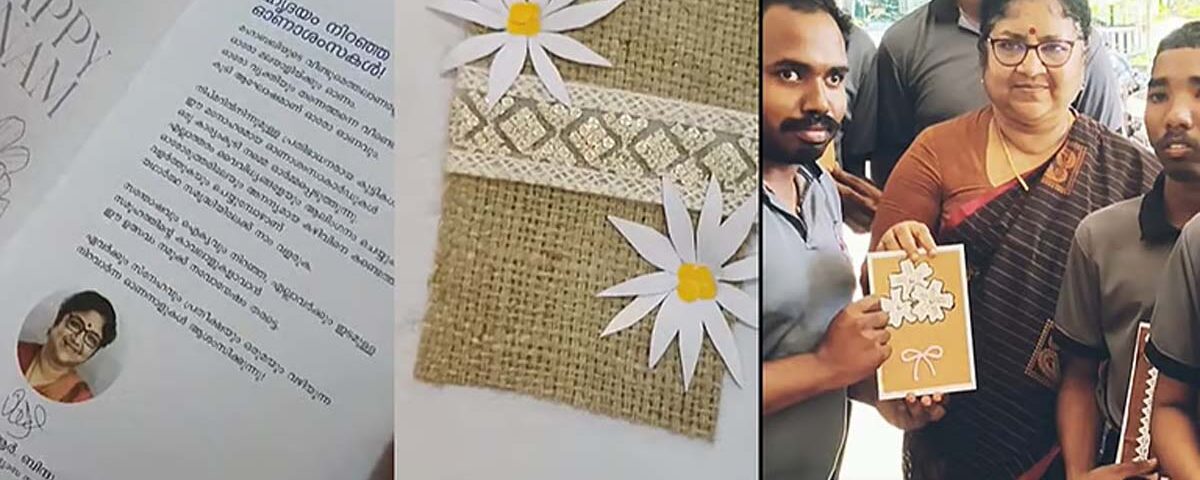 ചണം,വര്ണക്കടലാസുകള്, മുത്തുമണികള് എന്നിവ ഉപയോഗിച്ച് ഇരിങ്ങാലക്കുട നിപ്മറിലെ ഭിന്നശേഷിക്കാരായ എം വൊക്ക് വിദ്യാര്ഥികളാണ് ആയിരം ആശംസക്കാര്ഡുകള് സമ്മാനിച്ചത്. മനോഹരമായി ആശംസാ കാര്ഡുകള് നിര്മ്മിച്ച കുട്ടികളെ മന്ത്രി ആര്.ബിന്ദു അഭിനന്ദിച്ചു. നിപ്മറിലെ ഭിന്നശേഷി വിദ്യാര്ത്ഥികള് തയ്യാറാക്കിത്തന്ന മനോഹരമായ കാര്ഡുകള് ഈ ഓണത്തിന് വര്ണ്ണസുഗന്ധങ്ങളുള്ള പൂക്കളത്തിന്റെ സന്തോഷം പകരുന്നതാണെന്ന് മന്ത്രി ഫെയ്ബുക്കില് കുറിച്ചു.