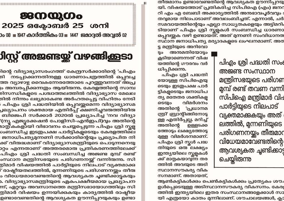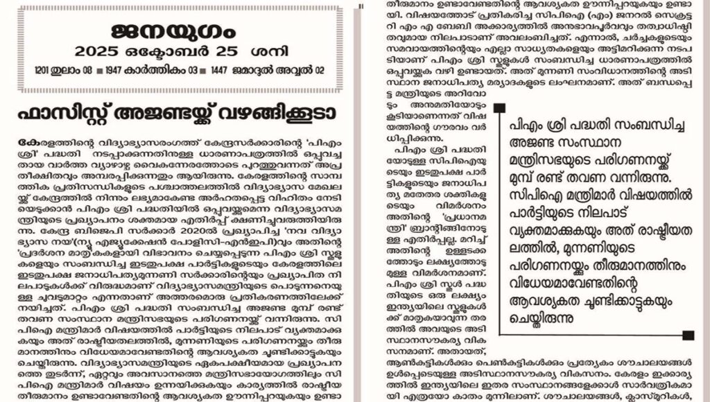 തിരുവനന്തപുരം : പിഎം ശ്രീ ഫാസിസ്റ്റ് അജണ്ടയാണെന്ന് സിപിഐ മുഖപത്രം ജനയുഗത്തിൽ വിമർശനം. പിഎം ശ്രീയുടെ ലക്ഷ്യം ആർഎസ്എസ് പ്രത്യയശാസ്ത്രത്തിന് അനുസരിച്ച് പുതുതലമുറയെ വാർത്തെടുക്കലാണ്. മതാധിഷ്ഠിതമായ സമൂഹ സൃഷ്ടിക്ക് വിത്തുപാകലാണ് പദ്ധതിയുടെ ലക്ഷ്യം. ചർച്ചകളുടെയും സമവായത്തിന്റെയും […]
