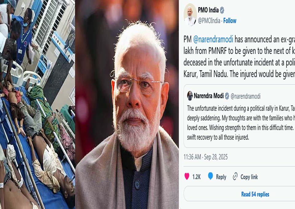 ന്യൂഡല്ഹി : തമിഴ് സൂപ്പര് താരം വിജയ് യുടെ രാഷ്ട്രീയ പാര്ട്ടിയായ തമിഴക വെട്രി കഴകം (ടിവികെ ) കരൂരില് സംഘടിപ്പിച്ച റാലിക്കിടെയുണ്ടായ ദുരന്തത്തില്പ്പെട്ടവരുടെ കുടുംബത്തിന് സഹായധനം പ്രഖ്യാപിച്ച് പ്രധാനമന്ത്രി നരേന്ദ്രമോദി. ദുരന്തത്തില് മരിച്ചവരുടെ കുടുംബത്തിന് […]