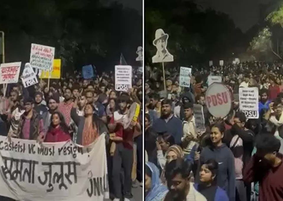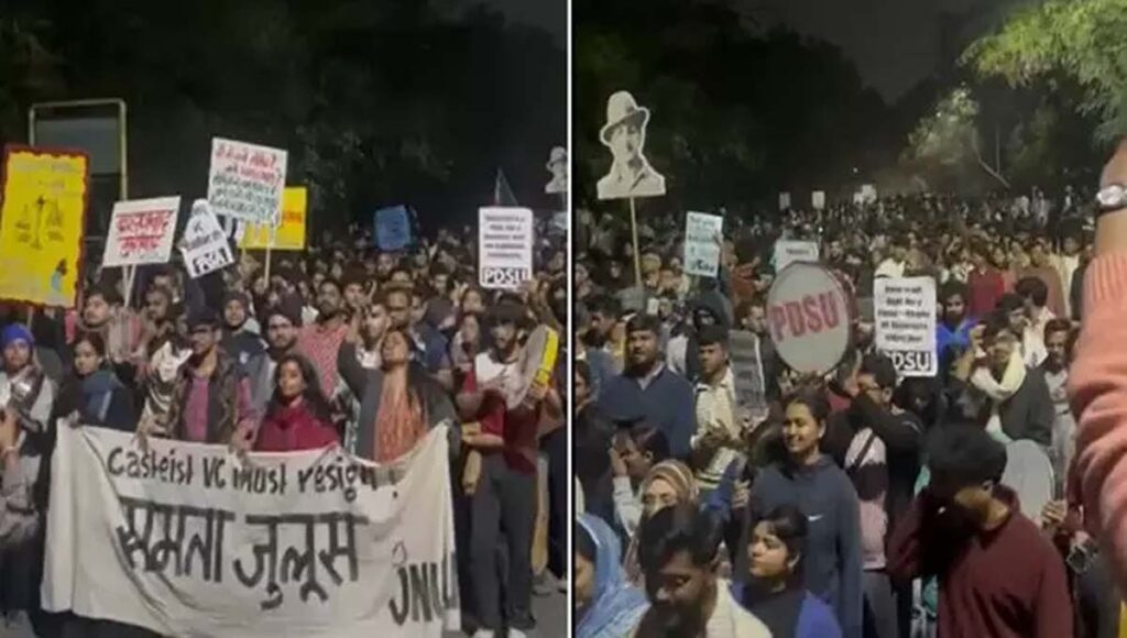 ഡൽഹി ജെഎൻയുവിൽ വിസിയുടെ രാജി ആവശ്യപ്പെട്ട് നടത്തിയ സമരത്തിന് നേരെ കല്ലേറ്